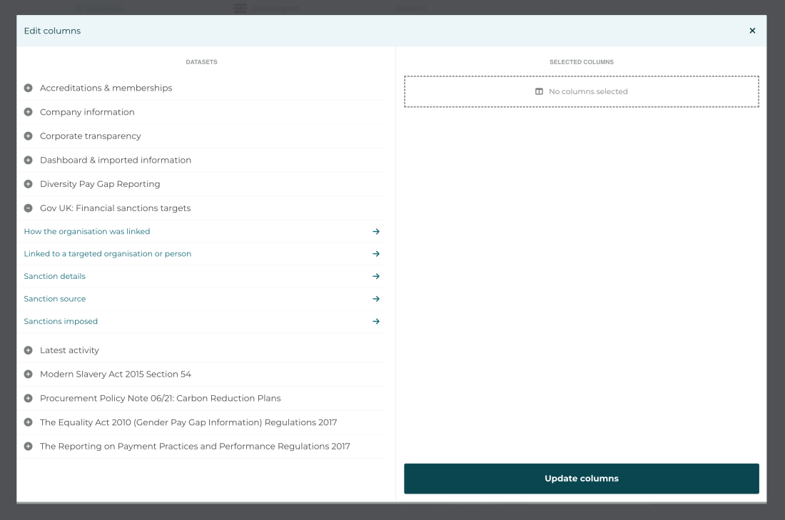 We have analysed the sanctions issued by UK, US and EU governments against individuals and corporate entities. With this data we have examined UK registered organisations and company director's names, addresses and date of births to flag any organisations which have matched via the company name or identified as a company director. Given that sanction targets often use multiple aliases across multiple countries it can be difficult to match an individual with 100% certainty so we would encourage you use this data as a means to narrow down your search and as a starting point for your own investigations.